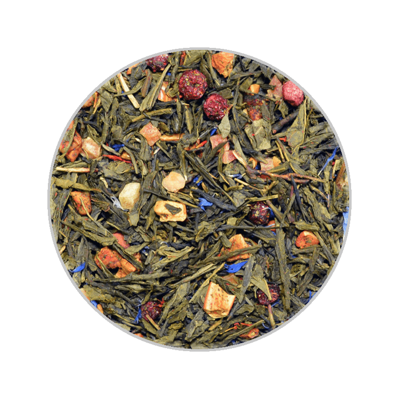 Green tea with apple pieces, papaya dices, red currants, safflowers, cornflower petals. Fruity pineapple-cherry-taste.