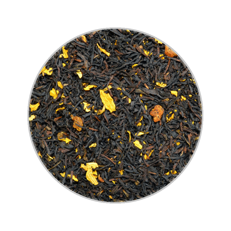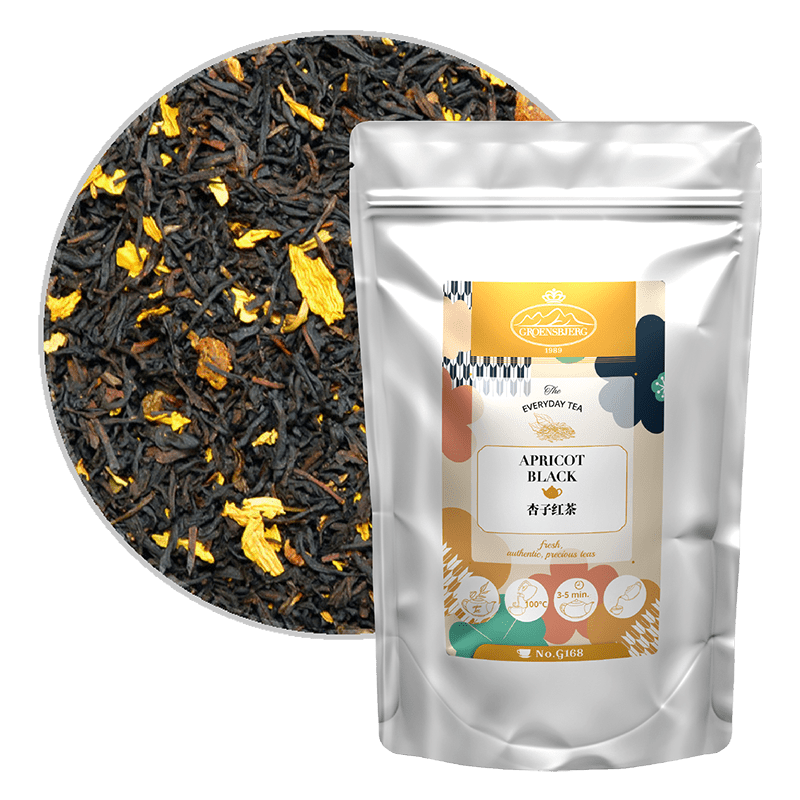 Black tea with apricot pieces and sunflower petals. Fruity gentle apricot-taste.