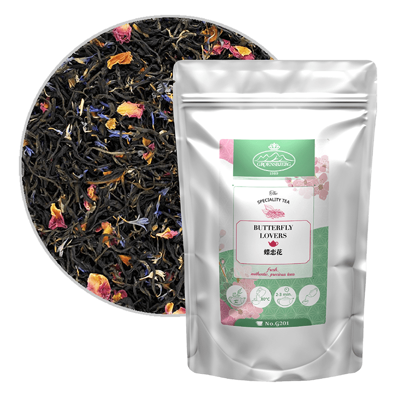 A sweet, light, fruity tea pleasure like tender butterflies in the tummy. Lovely blend with Green tea, black tea, rose petals, and scents of mango.