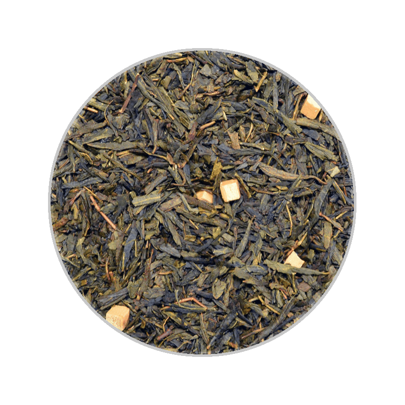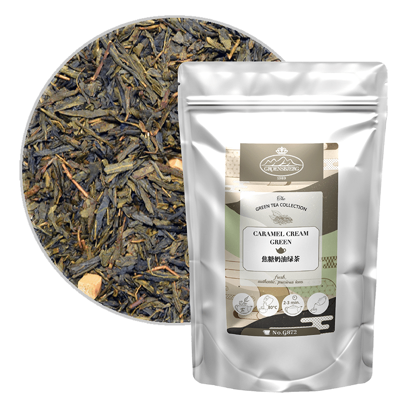 A cupful of creamy-sweet caramel that melts warm and softly on the tongue. China Sencha green tea with caramel pieces and cream flavor.