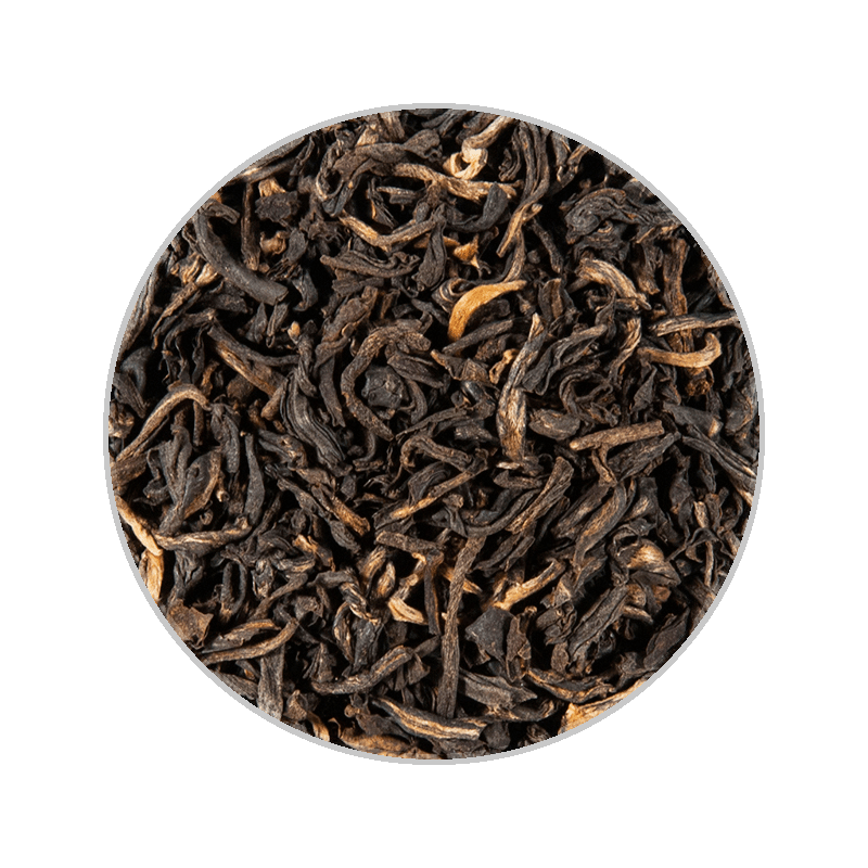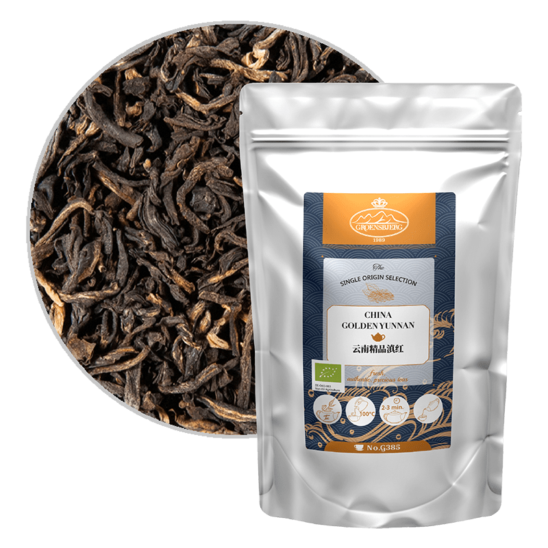 This very characteristic black tea comes from the high regions of Yunnan. It is and has a well worked leaf with golden brown tips. The flavor is sweetish-spicy and softly earthy, the cup dark and strong.
