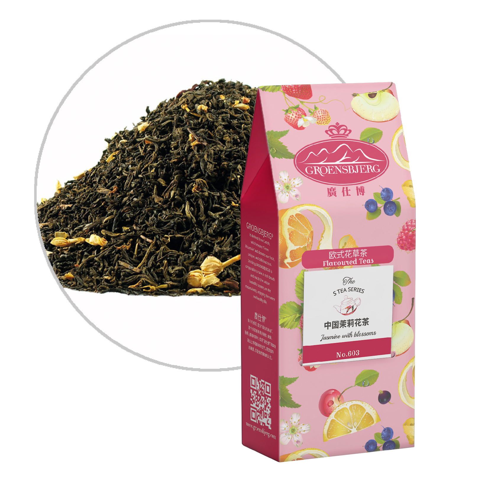 Green tea with jasmine blossoms.The jasmine flowers are picked when they begin to bloom and are layered over the tea leaves over night; the tea quickly absorbs the jasmine flavor, leaving the blossoms pretty but useless; any flower which remains in the final product is simply for decoration. This flavoring process is repeated with several batches of flowers. Tangy taste, golden cup.