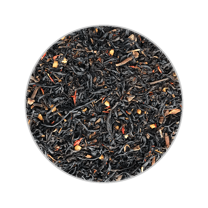 Black tea with pineapple cubes, chopped ALMONDS, cloves, cinnamon pieces, falvour, safflowers, ginger pieces.