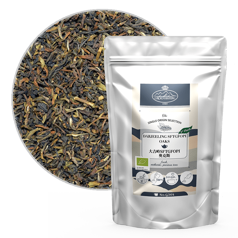 The Oaks tea plantation is located at an altitude of 1,600 m above sea level. The plantation cultivates only Chinese tea bushes (Thea sinensis). This first flush tea impresses with its mild elegance and its honey-sweet, yellow-golden cup.