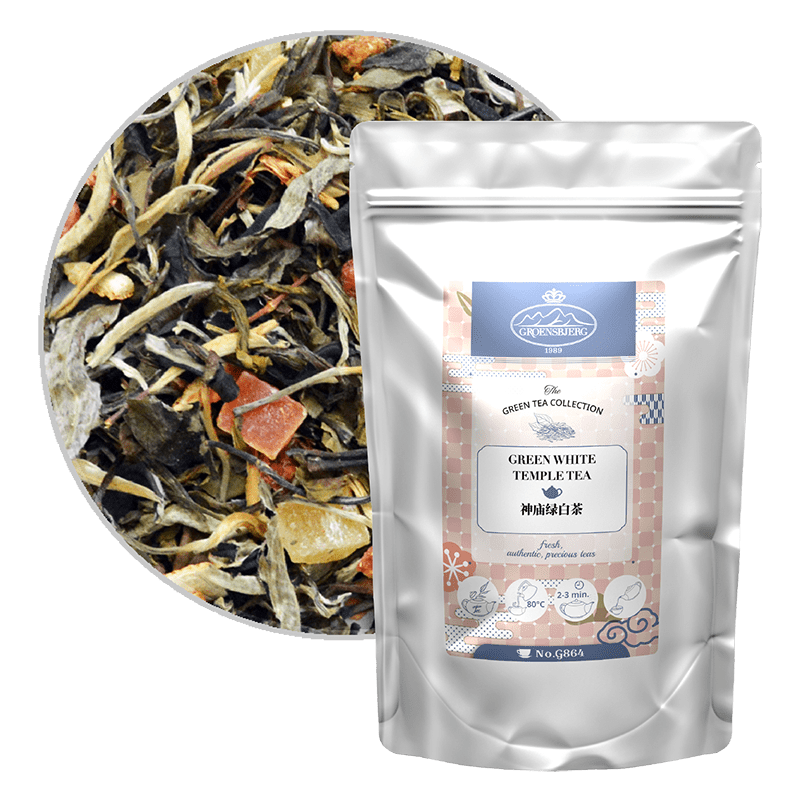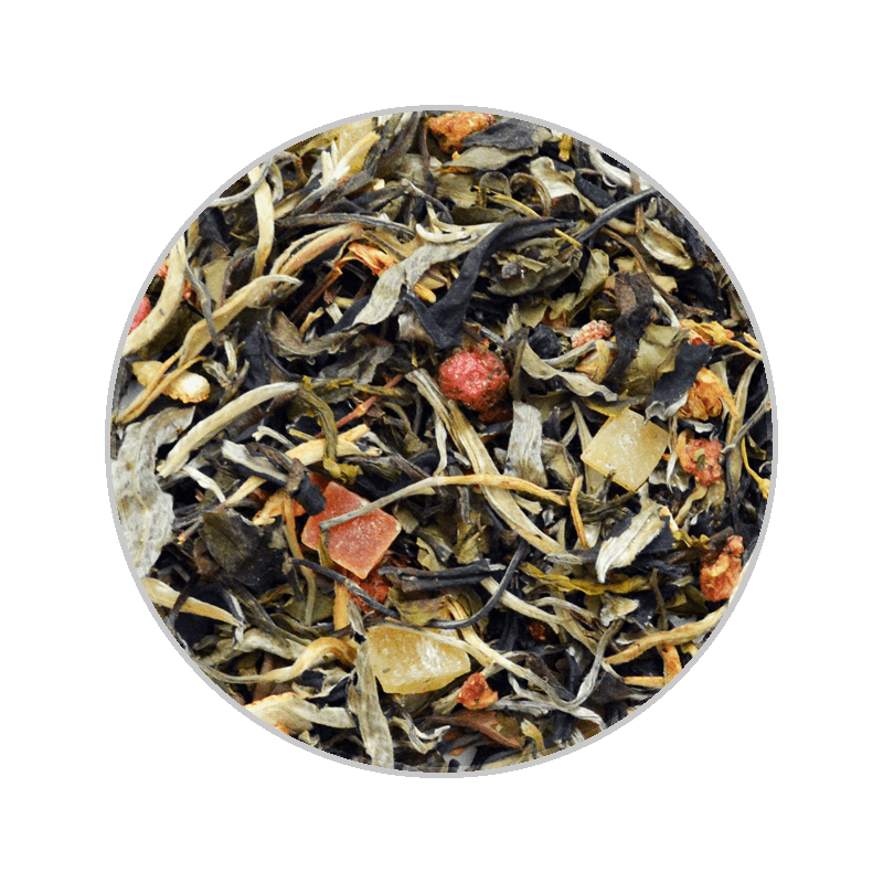Naturally flavored green white tea temple tea with orange peels, papaya pieces, mango dices, pineapple pieces. Giving a lovely gentle taste.