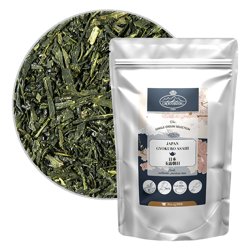 A Japanese rarity which roughly translates as "jewel dew". About two weeks before the harvest the tea bushes are covered with bamboo mats. The "shadow tea" develops less tannin, has a distinctly higher caffeine content and the leaves are a very dark green and slightly shiny. In Japan Gyokuro is served especially to guests of honour. It has an elegant, subtle, yet strong flavor with a touch of sweetness.