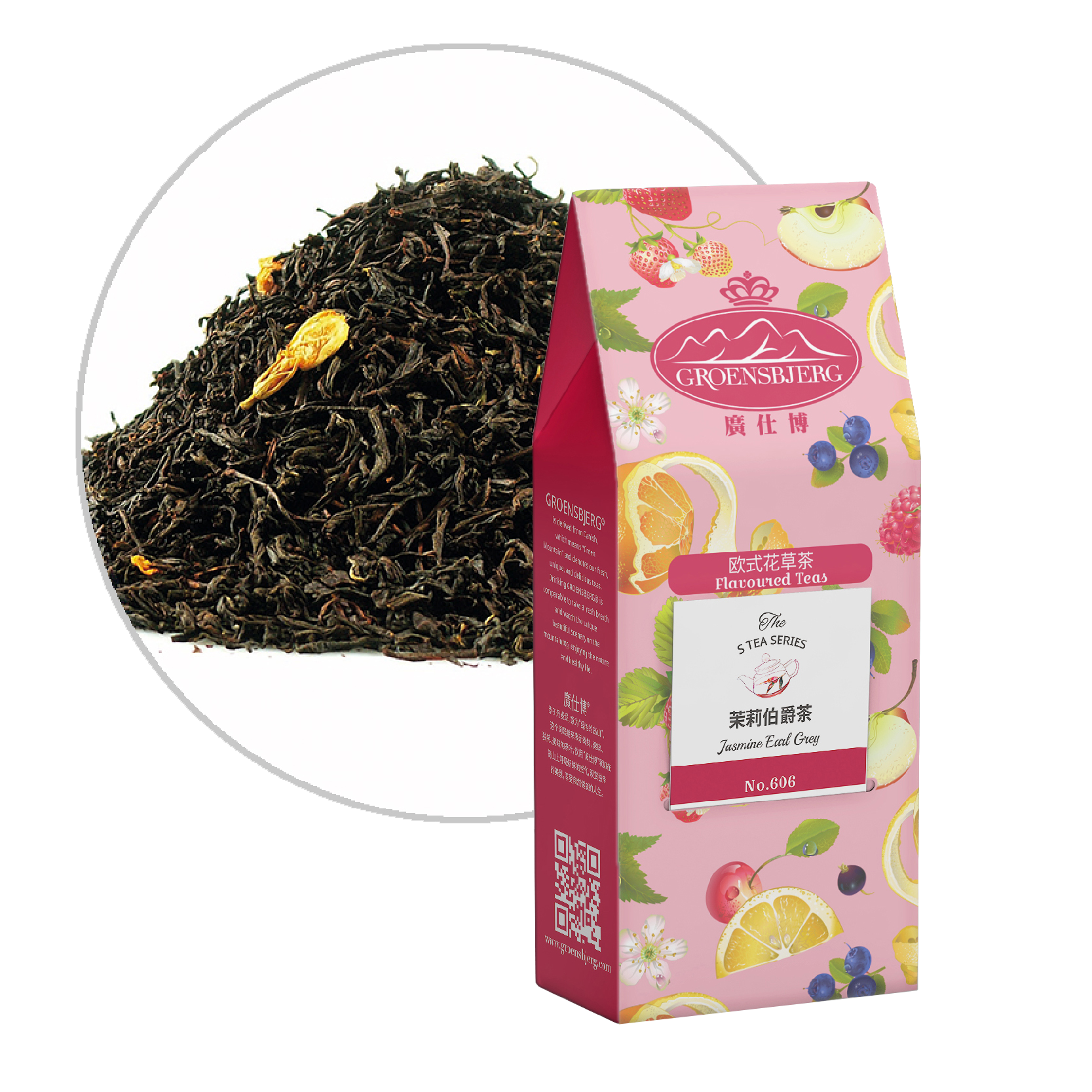 Flavored black tea blend with fine tart bergamot-taste and jasmine flowers.