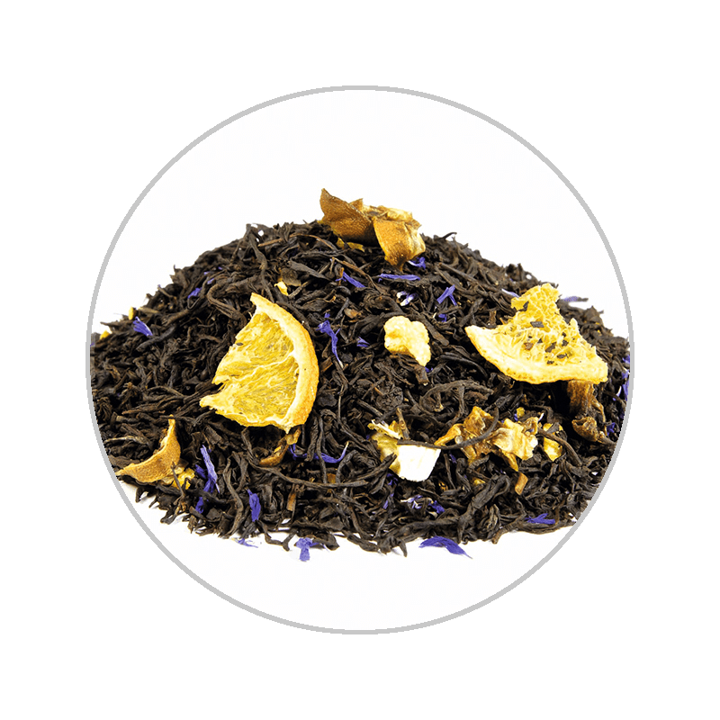 Naturally flavored black tea blend with orange pieces, blue cornflowers and refreshing-harmonious bergamot-taste.