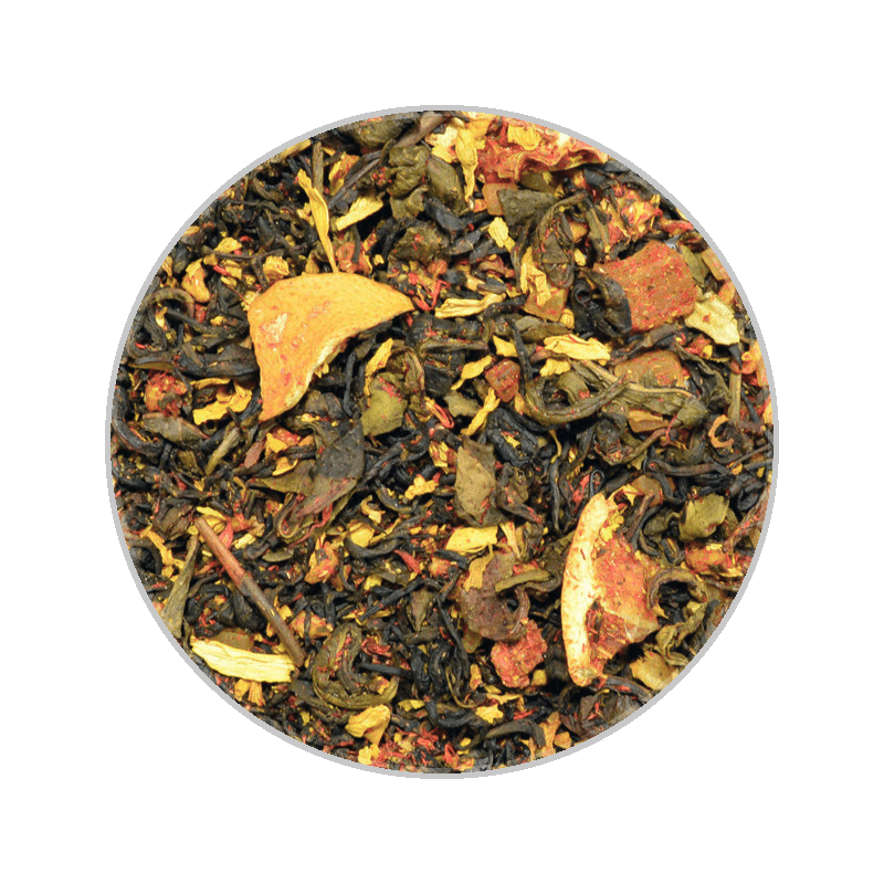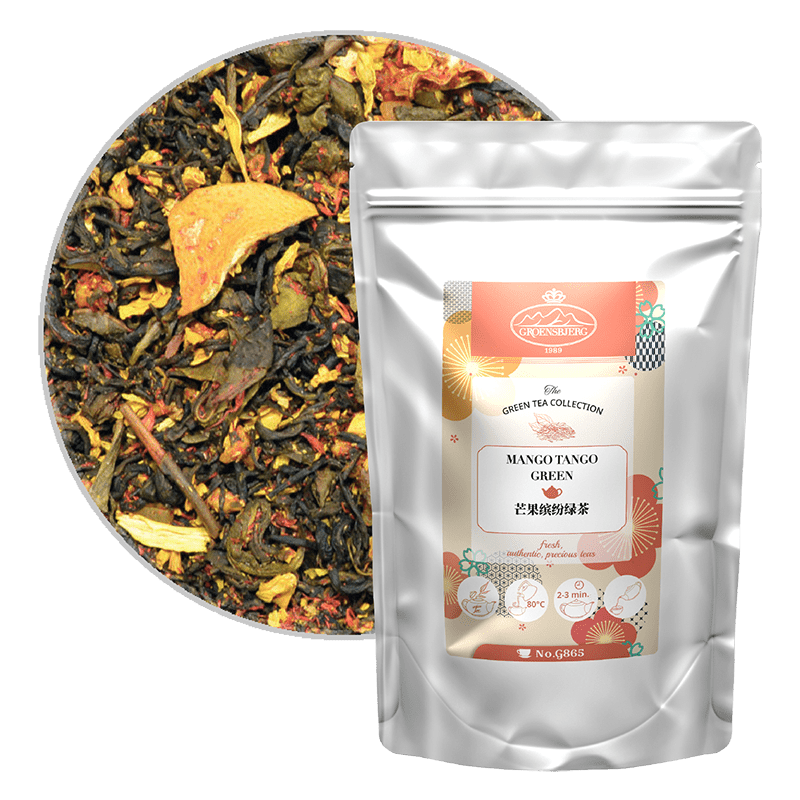 Green tea with pineapple pieces, mango cubes, orange pieces, strawberry pieces, sunflower petals, safflowers and mango flavor.