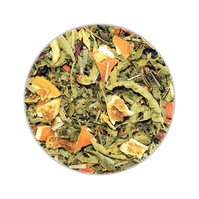 Herbal blend with blackberry leaves, lemon grass, apple pieces, pineapple pieces, vervain leaves, lemon balm leaves, buchu leaves. Fruity pineapple-peach-taste.