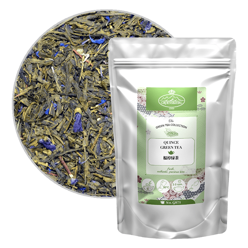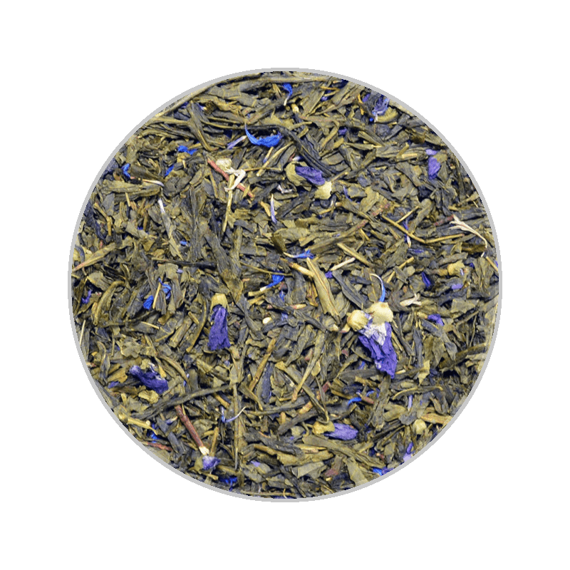China quince Sencha green tea with mallow blossoms, flavorings, cornflower petals.