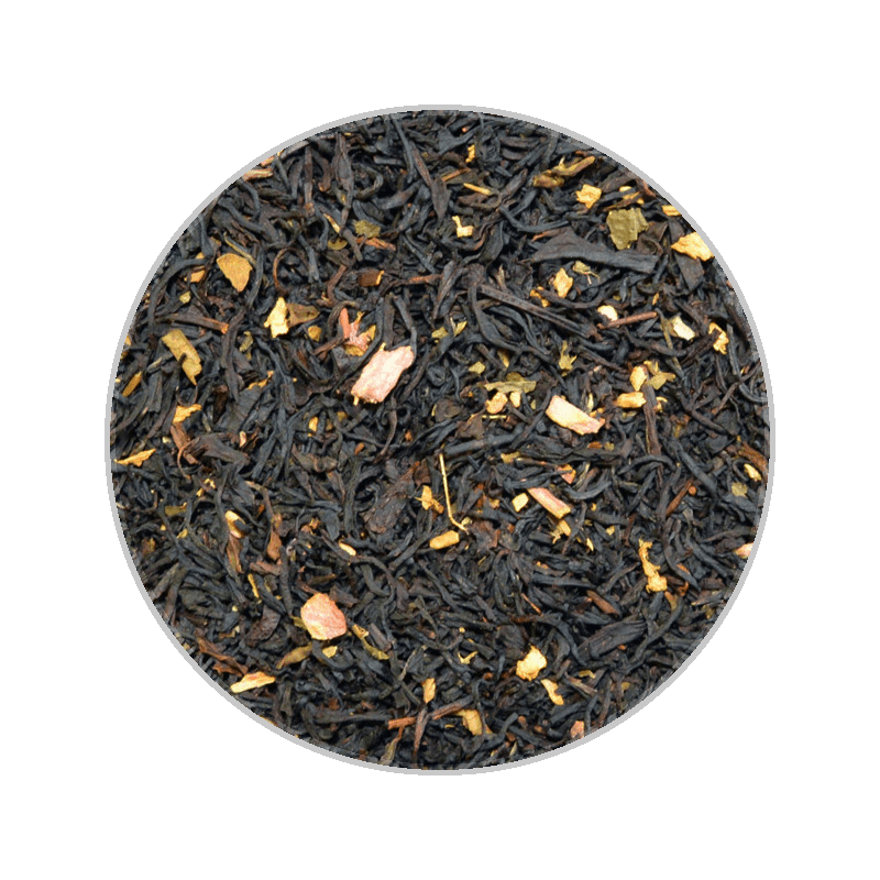 Black tea with rhubarb pieces, blackberry leaves. Refreshing creamy rhubarb-cream-taste.