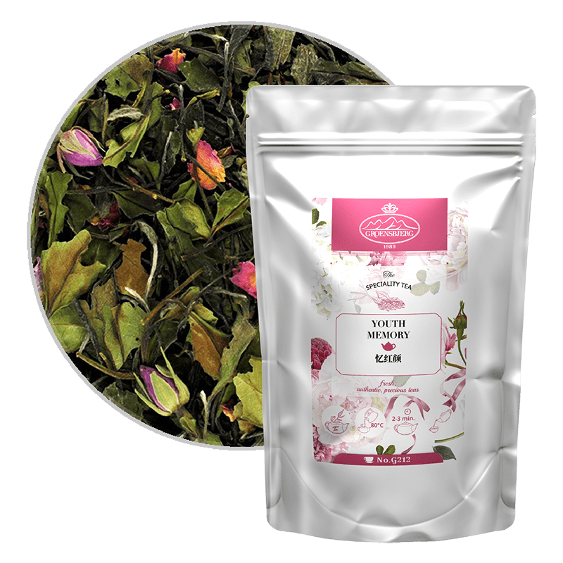 A cup of tea evokes beautiful memories. Peach-flavored white peony tea with rose buds and rose petals.