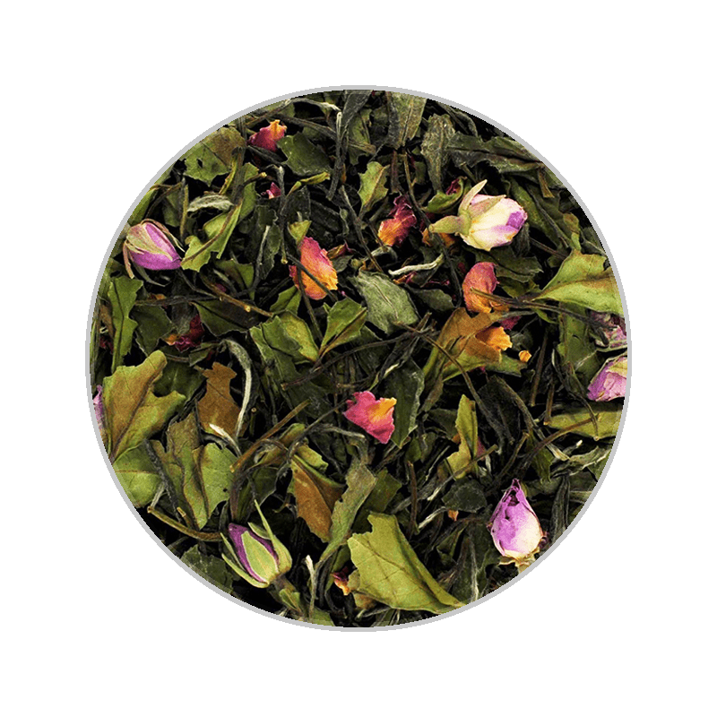 A cup of tea evokes beautiful memories. Peach-flavored white peony tea with rose buds and rose petals.